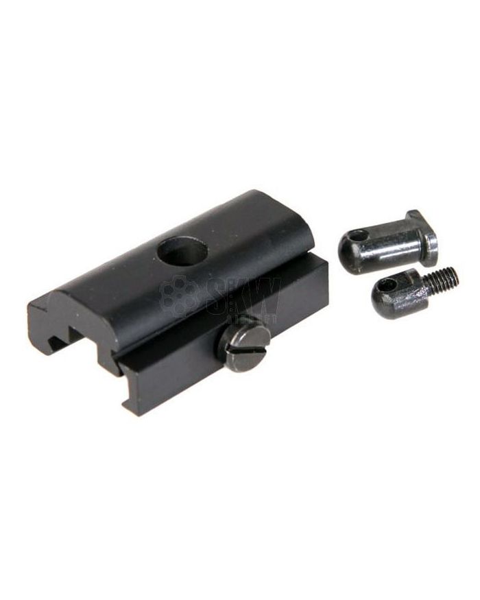 Pieza especial de aluminio para colocar un bípode en un raíl Picatinny. Este adaptador se ajusta sobre los huecos de un carril Picatinny, y permite colocar un bípode sobre el tornillo de fijación a la correa portafusil.