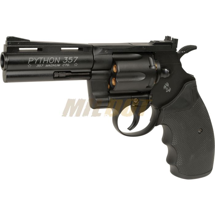 Revólver Colt 357 Python con cañón de 4" que funciona con bombonas de CO2 de 12 gramos y que se alimenta a través de un cargador de tambor con 6 vainas extraíbles para BB's del calibre 6mm. Potencia: 443 FPS.