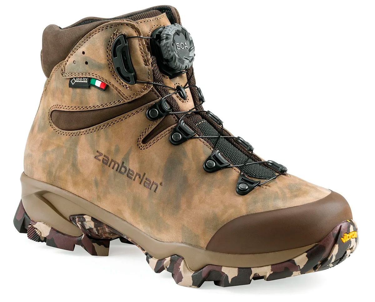 - La parte superior de cuero Nobuck de corte alto presenta un patrón de camuflaje exclusivo de Zamberlan®.