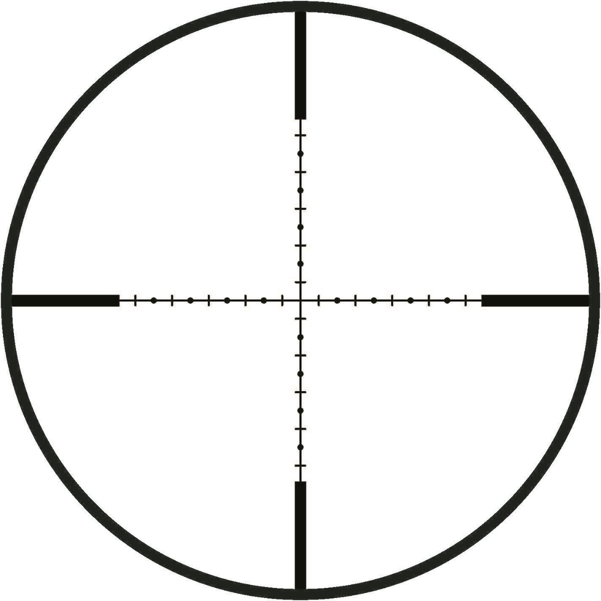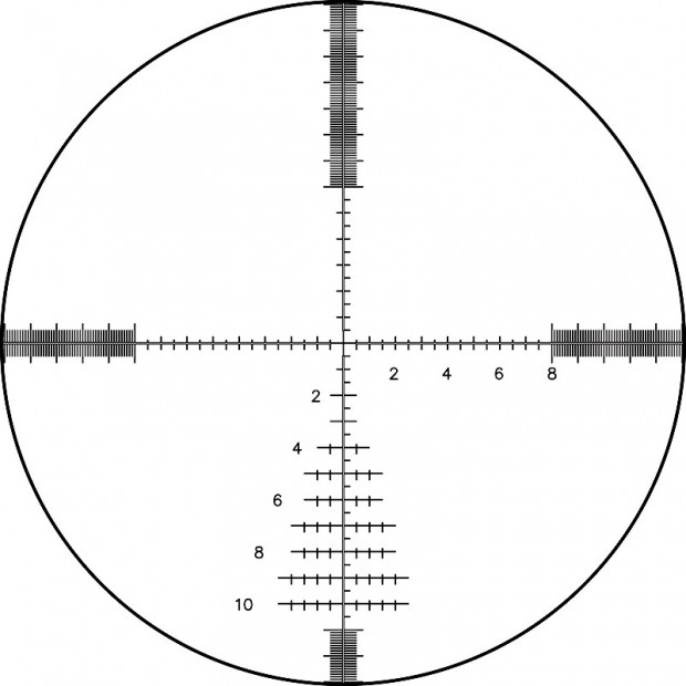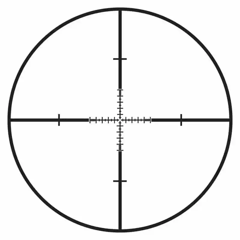 - Características: Similar a la Mildot estándar pero con marcas más finas y precisas. Incluye líneas y puntos adicionales para una mejor referencia.