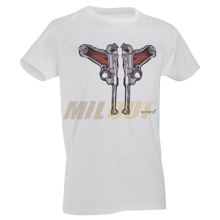 Camiseta de algodón de manga corta DEFCON 5 con el dibujo central de 2 pistolas Luger P08 a todo color.
