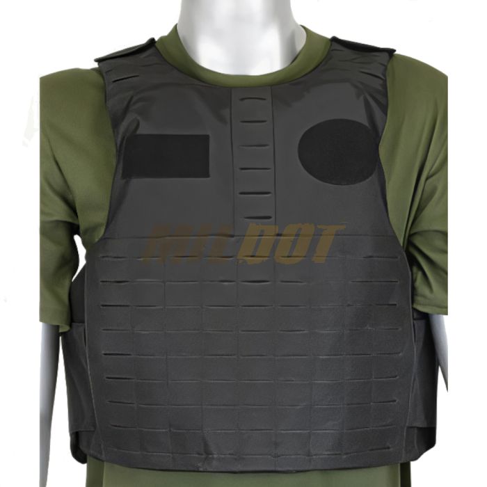 La protección principal se basa en 2 placas de acero desmontables (pecho y espalda), fijadas mediante velcro para poder retirarlas en operaciones de limpieza del chaleco. El ajuste se realiza mediante cinta elástica y velcro, permitiendo regular contorno y altura. Además, incorpora el sistema MOLLE “Laser cut” y paneles de velcro en la parte frontal y trasera, facilitando la fijación de accesorios compatibles.