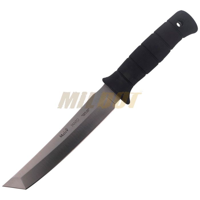 Cuchillo MUELA Tanto 19W con hoja satinada de 19 cm maciza con perfil tanto, de 5,4 mm de espesor, endurecida en el rango de 57-58 HRC. Fabricada en acero inoxidable, duradero y afilado, de molibdeno-vanadio X50CrMoV15. Cuchillo táctico con mango de goma.