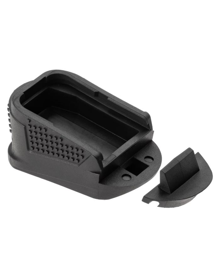 Extensión de cargador STRIKE INDUSTRIES para pistolas Glock 26 Gen 3 en color negro. Placa base de cargador en polímero de alta resistencia que añade 2 cartuchos en 9x19, con diseño de baja fricción para facilitar la recarga. Aporta superficie de agarre adicional e incluye tapón de bloqueo.
