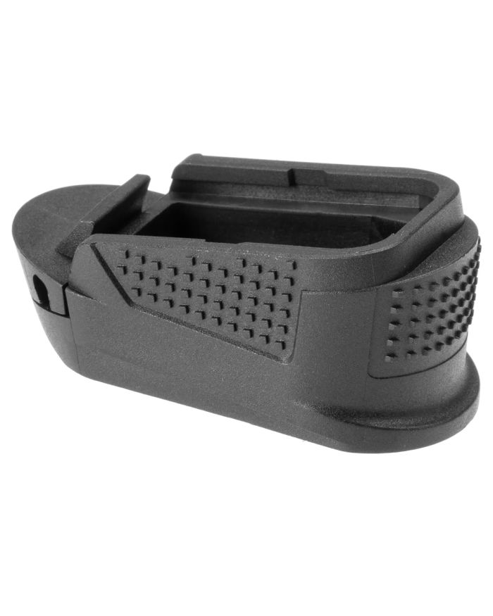 Extensión de cargador STRIKE INDUSTRIES para pistolas Glock 26 Gen 4/5 en color negro. Placa base de cargador en polímero de alta resistencia que añade 2 cartuchos en 9mm, con diseño de baja fricción para facilitar la recarga. Aporta superficie de agarre adicional e incluye tapón de bloqueo.
