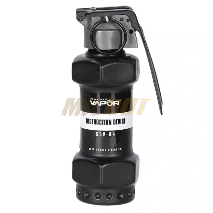Granada CO2 SPECNA ARMS VAPOR en color negro, suministrada con un cuerpo principal reutilizable y 12 carcasas de recambio. Está diseñada para simular una detonación sonora mediante CO2, sin materiales pirotécnicos, en airsoft, recreación histórica y entrenamiento en entornos controlados.