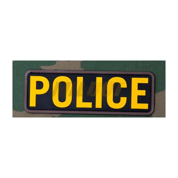 Parche de PVC con velcro con la palabra POLICE (Policía) en color amarillo y negro. Este parche militar está fabricado con goma en 3D de alta calidad, lo que permite utilizarlo según las necesidades y especificaciones de las fuerzas del orden.