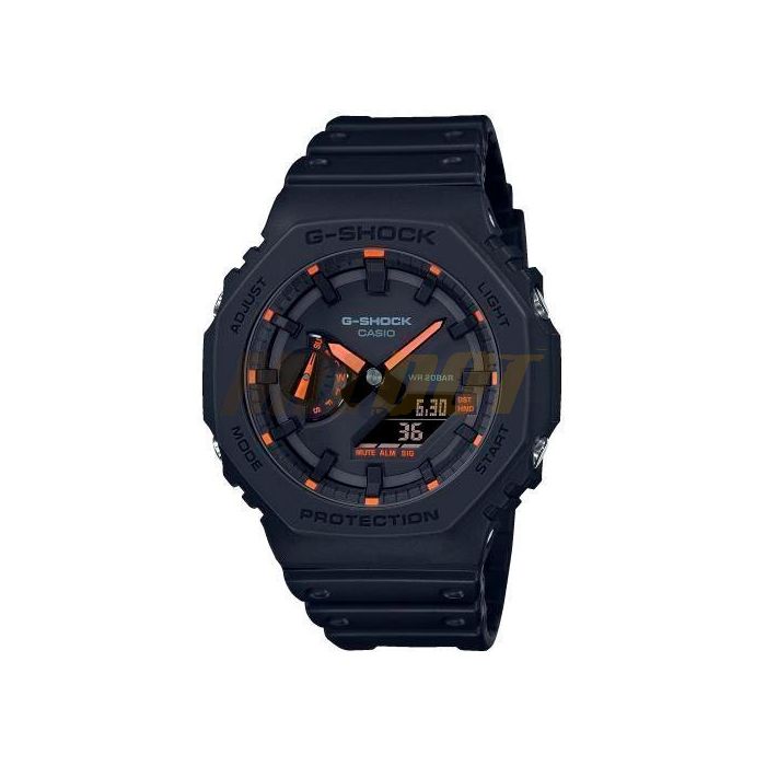 Reloj Casio G-SHOCK modelo GA-2100-1A4ER en color negro con detalles en naranja. Una combinación digital-analógica perfecta en un diseño cuidado, resistente y novedoso. Fabricado en carbono y resina.