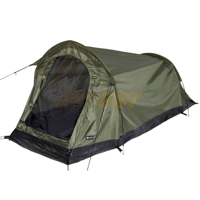 Tienda de campaña MFH Schwarzenberg en color verde. Tienda para una persona que dispone de una sola entrada, de tipo túnel, que se cierra con cremallera. En esta entrada se ha añadido una mosquitera que permite abrir para ventilar sin que accedan insectos. Columna de agua: 2000 mm.