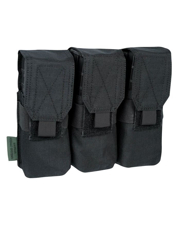 Triple funda porta cargador WARRIOR ASSAULT Covered diseñada para llevar 6 cargadores del rifle M4 5.56mm. Funda con cierre de tapa, equipada con paneles MOLLE en su parte frontal, y 4 tiras de anclaje MOLLE en su parte trasera. Color negro.